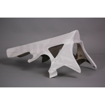 Spodní díl se dodává s již nainstalovanou žáruvzdornou fólií, která chrání kapotáž od tepla z výfukového potrubí a motoru. Výpustný špunt zaručuje bezproblémové vypuštění kapalin ze spodního dílu pro umytí motocyklu. Dodává se v základním materiálu GFK (sklolaminát), má standardně bílou barvu Aral 9003 a je UV stabilní, takže není již třeba lakovat a je připraven rovnou k použití. Vyznačuje se hladkým povrchem. Díry pro uchycení nejsou předvrtané, ale naznačené. Proč laminátové kapotáže? Znamenají až 50% váhovou úsporu oproti originálním ABS kapotám a jsou podstatně levnější. Jsou pružnější a lépe se instalují na motocykl.