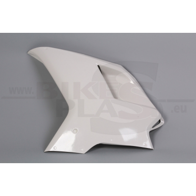 Použitý materiál: GFK - Sklolaminát FLEXI v barvě bílé RAL 9003 + 3 x K-K (kevlar-karbon) výztuhy v místě uchycení. Tepelná odolnost používaného materiálu je 100°C. Sklolaminát má v základním materiálu GFK standardně bílou barvu RAL 9003 a je UV stabilní, takže již není třeba lakovat. Veškeré díly jsou připraveny rovnou k použití. Díry pro uchycení kapotáží nejsou předvrtané, ale naznačené. Proč laminátové kapotáže? Znamenají až 50% váhovou úsporu oproti originálním ABS kapotám a jsou podstatně levnější. Jsou pružnější a lépe se instalují na motocykl.