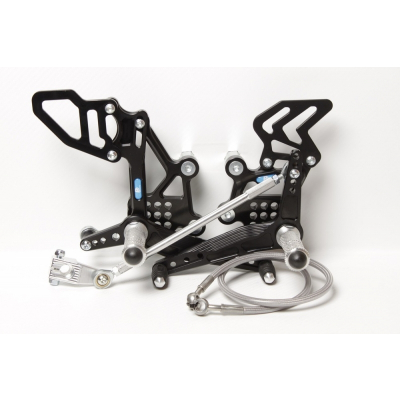 Plně nastavitelný stupačkový set s reverním řazením * materiál dural 7075 T6, kalený * páčky osazeny kuličkovými ložisky Ø 22mm těsněné proti prachu a vodě * 9 možností polohování + nastavitelnost páček podle velikosti bot * speciální odlehčení * tvrdá anodizace garantující maximální životnost * exclusivní design * vč. zadní ocelové brzdové hadice.