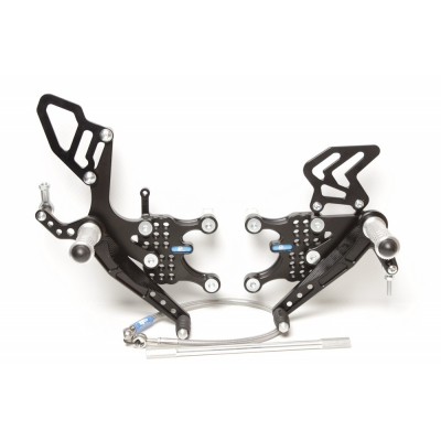 Plně nastavitelný stupačkový set * materiál dural 7075 T6, kalený * páčky osazeny kuličkovými ložisky Ø 22mm těsněné proti prachu a vodě * 9 možností polohování + nastavitelnost páček podle velikosti bot * speciální odlehčení * tvrdá anodizace garantující maximální životnost * exclusivní design * stupačkový set je použitelný také pro reversní řazení - stačí přetočit mezikus s tisícihranem na ose řazení o 180° * Součástí dodávky je také zadní ocelová brzdová hadice.
