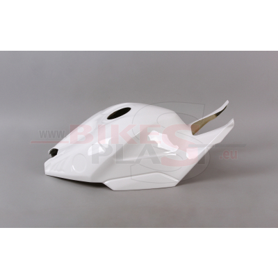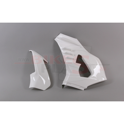 Přední blatník je určený pro instalaci na originální montážní úchyty přední vidlice motocyklu. Použitý materiál: GFK - Sklolaminát FLEXI v barvě bílé RAL 9003 + 3 x K-K (kevlar-karbon) výztuhy v místě uchycení. Tepelná odolnost používaného materiálu je 100°C. Sklolaminát má v základním materiálu GFK standardně bílou barvu RAL 9003 a je UV stabilní, takže již není třeba lakovat. Veškeré díly jsou připraveny rovnou k použití. Díry pro uchycení kapotáží nejsou předvrtané, ale naznačené. Proč laminátové kapotáže? Znamenají až 50% váhovou úsporu oproti originálním ABS kapotám a jsou podstatně levnější. Jsou pružnější a lépe se instalují na motocykl.